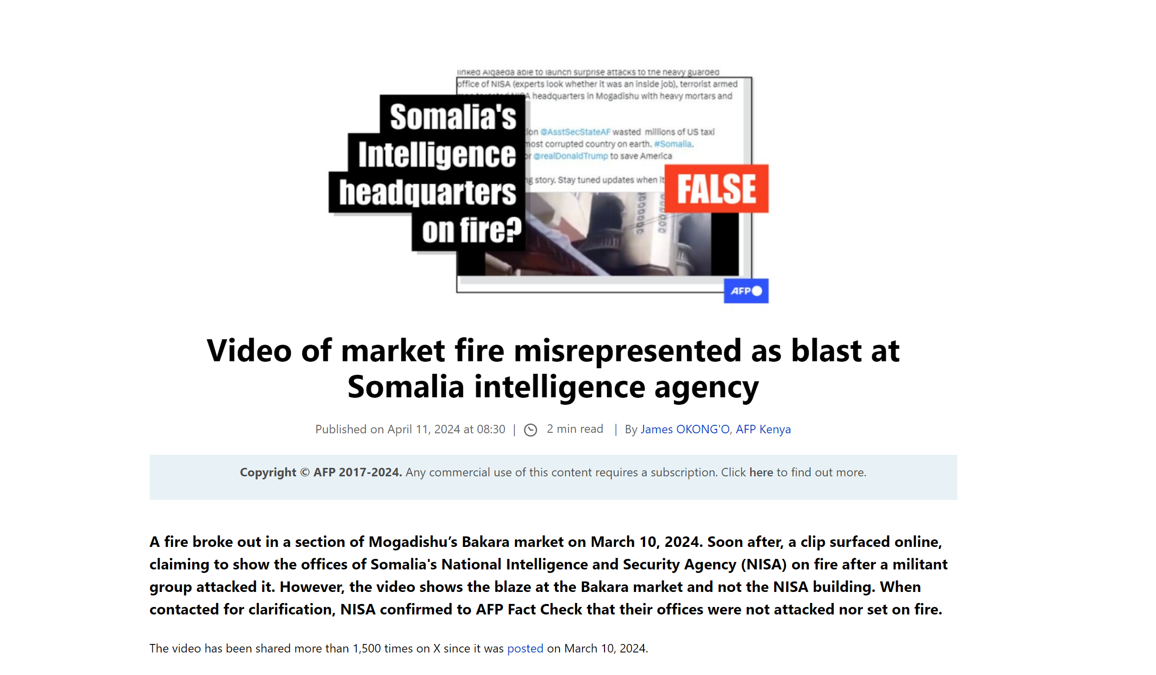 Tusaale: 2024-kii bisha Abriil waxaa baraha bulshada eey soo galiyeen dad kala duwan oo rabey ineey marin habaabiyaan bulshada, muuqaal eey leeyihiin waa xarunta nabadsugida(NISA) ee Soomaaliya oo la qarxiyay, kaasoo ahaa muuqaal dhisme ololaaya oo dabku is qabsaday. Warkaas waxaa beentiisa xaqiijiyay hey'ada Agence France-Presse (AFP) xafiiskeeda Keenya, kadib markii uu baraha bulshada is qabsaday oo dadka intooda badan eey a wadaageen asxaabtooda sidi in uu war run ah yahay, muuqaalkuna wuxuu ahaa suuqa bakaaraha ee Muqdisho oo gubanaya ma aheyn xarunta NISA.