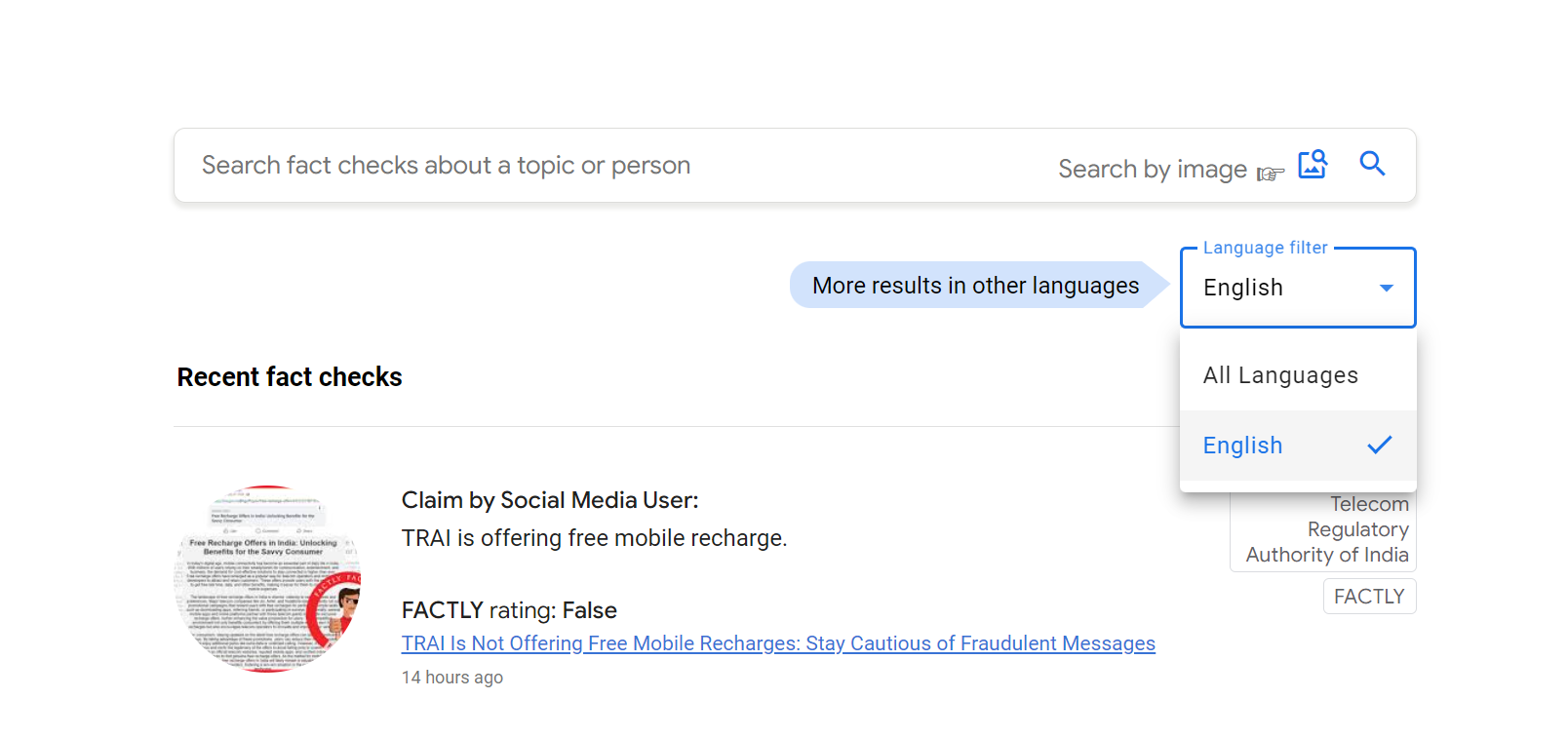 Websaaydyada ama baraha internetka ee ku taxluuqa xaqiijinta wararka ee caalamka waxaa la isugu soo aruuriyay intooda badan barnaamij la yiraahdo Google Fact Check Tools oo eey google leedahay, beejka ugu horeeyo marki aad tagto waxaad arkeysaa masawiradii iyo muuqaaladii ugu dambeeyay ee la xaqiijiyay runtooda iyo beentooda. Luqada qoraalka beejkaas uu kuugu soo bixi doono, waxey ku xirantahay browserka aad isticmaaleysid luqada uu kuu joogo markaas. Hadii add rabto inaad luqadaha dhan aragto, liiska hoos u kala baxaaya oo eey ku qorantahay "Language Filter" ka dooro "All Languages".